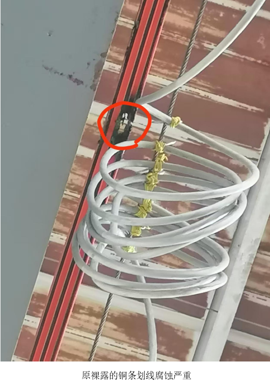 該車間原行車電源采用傳統(tǒng)裸露式銅條滑線,因工作環(huán)境中有腐蝕性氣體和濕氣,銅滑線被嚴(yán)重腐蝕甚至斷裂,行車電源故障頻發(fā),嚴(yán)重影響物料轉(zhuǎn)運(yùn)與生產(chǎn)工序,維護(hù)工作也耗費(fèi)大量人力物力。
