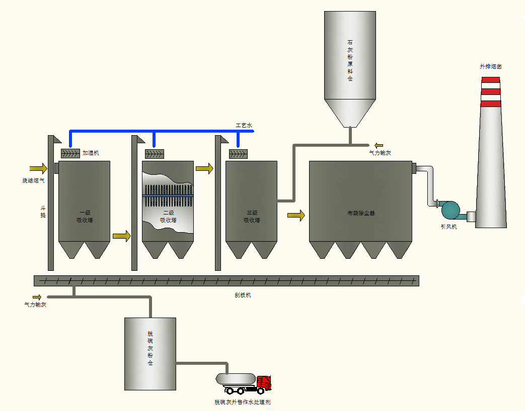 煙氣超潔凈脫硫設(shè)計(jì)采用單塔一體化脫硫除塵工藝。脫硫劑為石灰石漿液,石灰石由于其良好的化學(xué)活性及低廉的價(jià)格因素成為目前世界上濕法脫硫廣泛采用的脫硫劑制備原料。在吸收塔內(nèi)煙氣中的SO2與石灰石反應(yīng)后生成CaSO3,并就地強(qiáng)制氧化為石膏,石膏經(jīng)二級(jí)脫水處理作為副產(chǎn)品資源化利用。吸收塔采用單回路噴淋塔設(shè)計(jì),并將設(shè)置有氧化空氣管道的漿池直接布置在吸收塔下部,塔內(nèi)吸收段設(shè)置多層噴淋(1層備用),塔上部設(shè)置屋脊除霧……